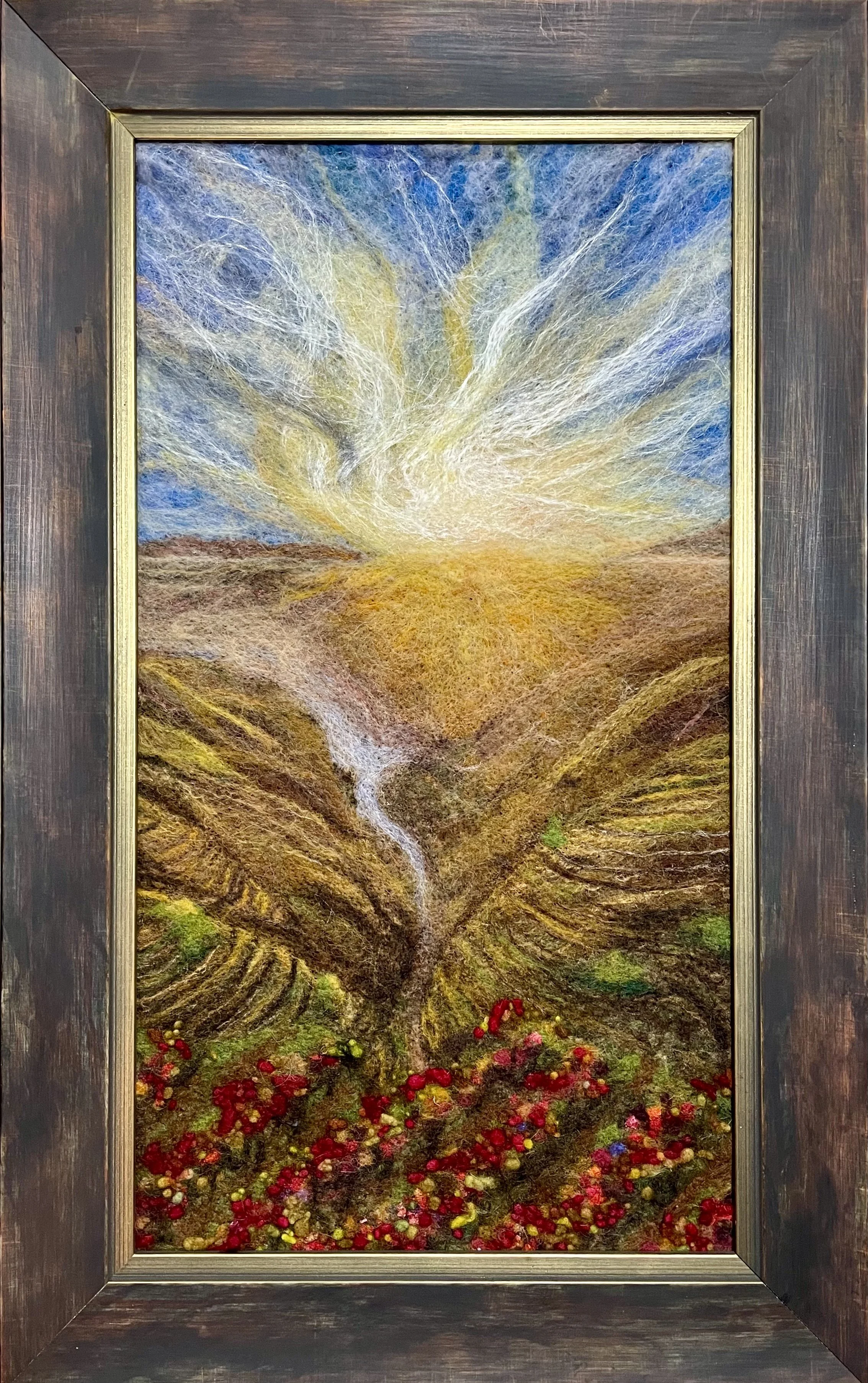 An explorative collection of 2D fiber art celebrating the beauty and texture of silk and wool in visual and wearable forms. Techniques include hand-dyed, painted, or marbled silk on canvas, beautiful, wearable silk scarves, and wet + needle felted wool and silk.